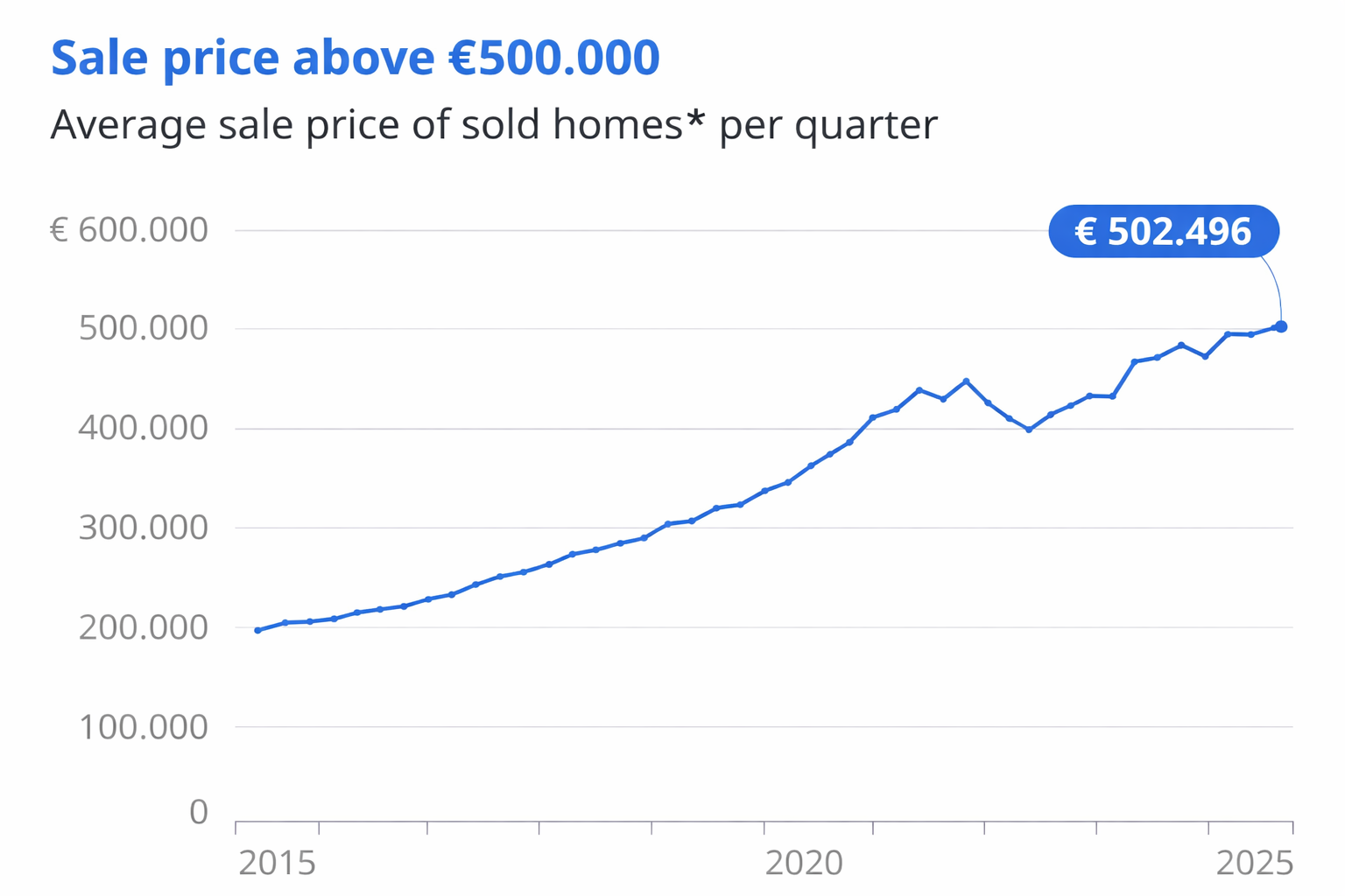 In the fourth quarter of 2025, the average transaction price of a home in the Netherlands exceeded €500,000 for the first time. This represents a 3.9% increase compared to the same period last year, although price growth has been slowing in recent quarters.