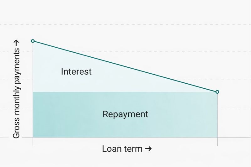 Because the outstanding loan is highest at the start, monthly payments are relatively high in the early years. As the loan balance decreases over time, you pay less interest and your monthly payments gradually go down.